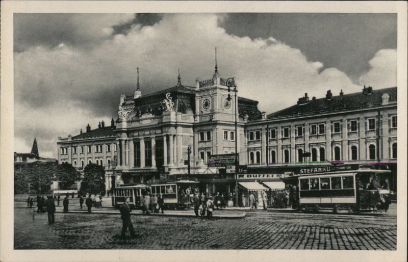 A view of the main railway station (Nádraží) in Brno, with several trams and pedestrians in the foreground. The building features ornate architectural details, including statues and a clock tower. A sign for a "BUFFET" is visible on a lower structure. |