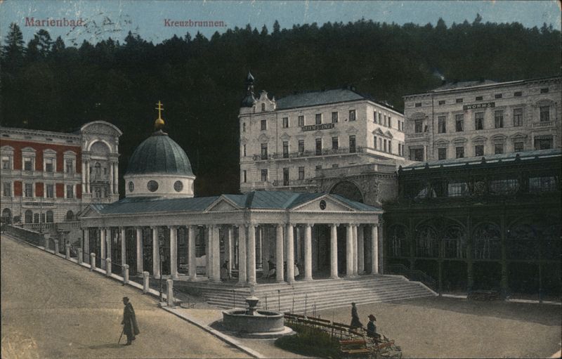 View of the Kreuzbrunnen (Cross Spring) Colonnade in the spa town. In the background, the Hotel Klinger and other buildings are visible against a forested hill.