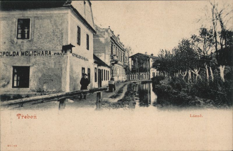 A view down a dirt road alongside a canal. A prominent stucco building on the left has text reading "LEOPOLDA MELICHARA" and "HOST. MĚSTSKÉHO PIVOVARU". A man and another figure stand near a wooden railing in the foreground.