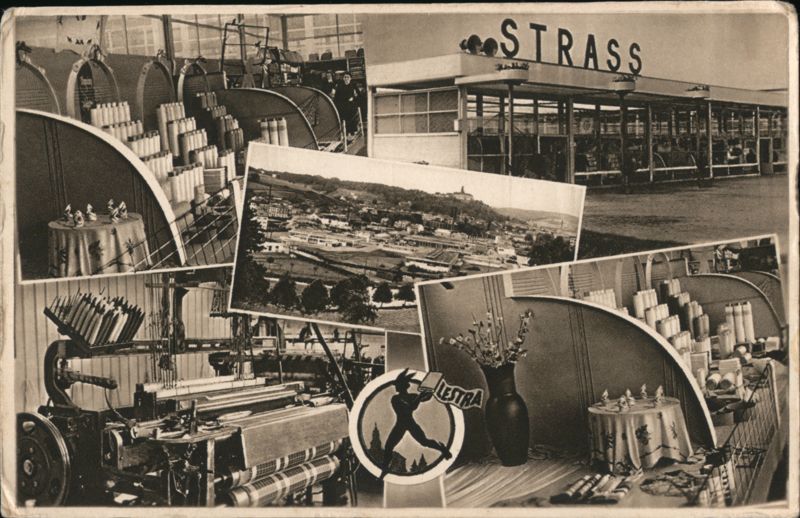 A montage showing the Strass company pavilion, textile machinery (looms), and displays of fabric bolts. The company logo for 'Lestra' is featured. The text on the back identifies the company as Leo Strass a spol., the largest textile mail-order business, located in Náchod. |