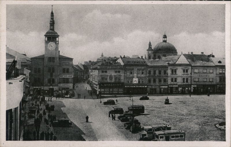 View of the main square (Velké náměstí) in Kroměříž, featuring the Town Hall (Radnice) clock tower on the left. The square is active with pedestrians and early model cars. Storefronts line the square, including one for 'ÚVĚRNÍ BANKA KROMĚŘÍŽ' on the town hall building. The dome of the Church of St. Moritz is visible in the background. |