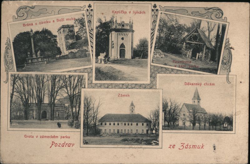 A composite of six views from Zásmuky, Czech Republic. Captions in Czech read: Brána u zámku a Boží muka (Gate at the castle and Wayside shrine), Kaplička v lipkách (Chapel in the linden trees), Poustevna v zám. parku (Hermitage in the castle park), Grota v zámeckém parku (Grotto in the castle park), Zámek (Castle), and Děkanský chrám (Dean's church). |