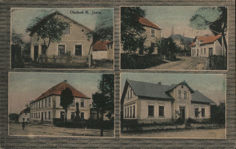 A collage of four scenes from the town of Libuň. The top left image shows the shop of K. Justa. Other images show various buildings and streets in the town.
