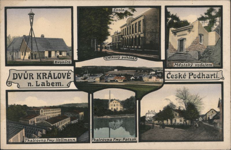 A multi-view collage of Dvůr Králové nad Labem. Scenes include the Zvonice (bell tower), Škola (school), Městský vodojem (municipal water tower), a celkový pohled (overall view), the Hellmann and Patzak weaving mills (tkalcovna), and a street scene. |