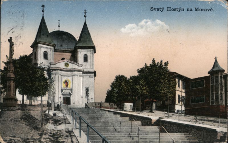 View of the Basilica of the Assumption of the Virgin Mary at the pilgrimage site of Svatý Hostýn. A long flight of stairs leads up to the church entrance, with a statue on a pedestal to the left.