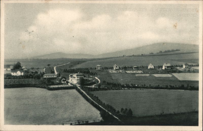 A panoramic view of the village of Čejkovice, showing a prominent building in the center, houses scattered across rolling hills, and winding country roads.