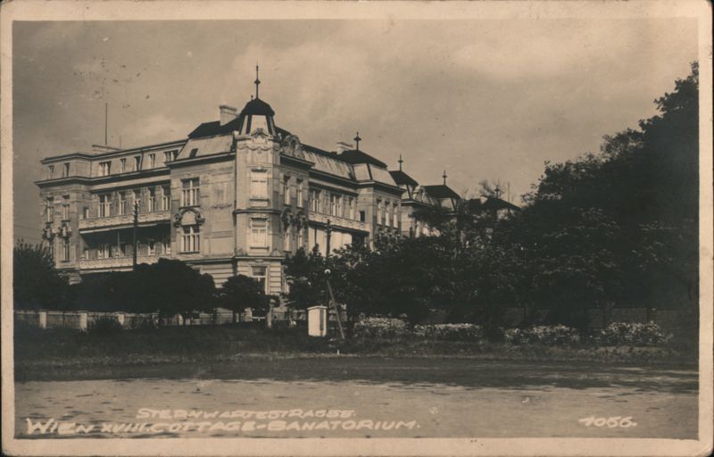 The Cottage Sanatorium in the 18th district of Vienna (Währing), viewed from across a grassy area. The image shows the corner and main facade of the multi-story building with balconies and ornate architectural details.