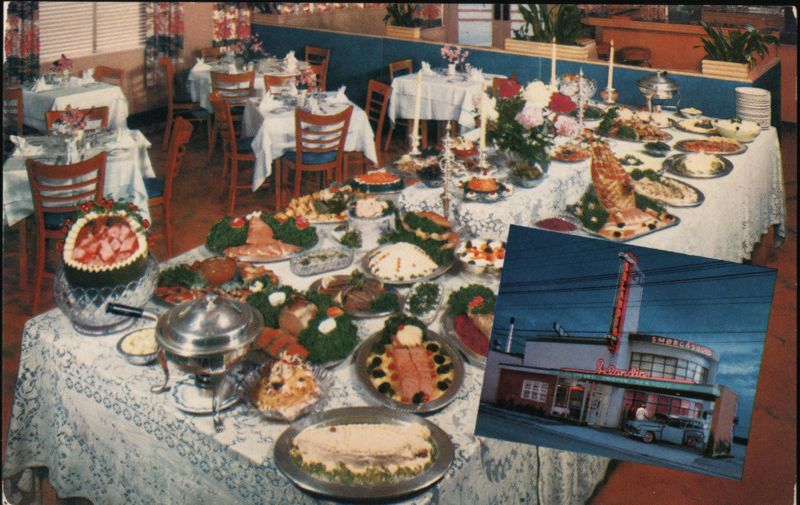 Interior view of a grand buffet with 60 dishes and exterior of Selandia restaurant on Puget Sound. Features steaks, seafood, banquet rooms, catering, and a Copenhagen Room for cocktails. Recommended by Duncan Hines.