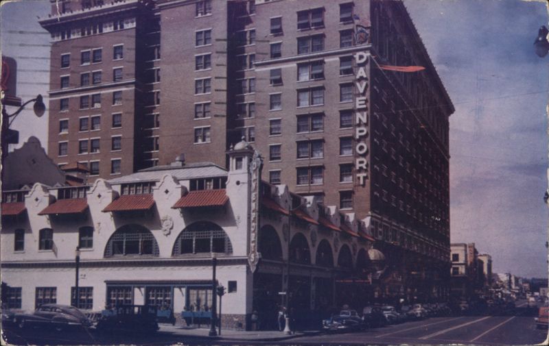 View of the grand Davenport Hotel and its lower annex building from the street, with parked cars.