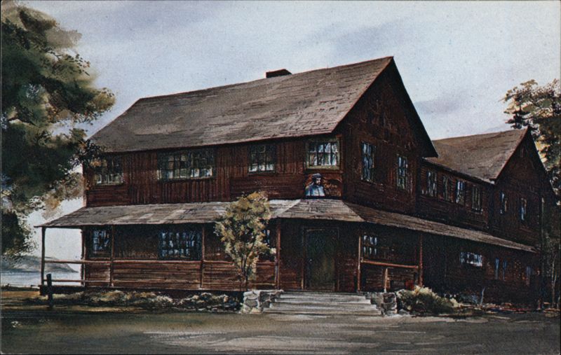 A painting of The Captain Whidbey, a rustic wooden inn offering intimate cocktails, gourmet dining among antiques, and cozy accommodations with fireplaces overlooking the sea.