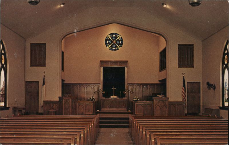 View of the church interior, featuring rows of pews, a central altar with a cross, and stained glass windows. A prominent circular stained glass window is visible above the altar.