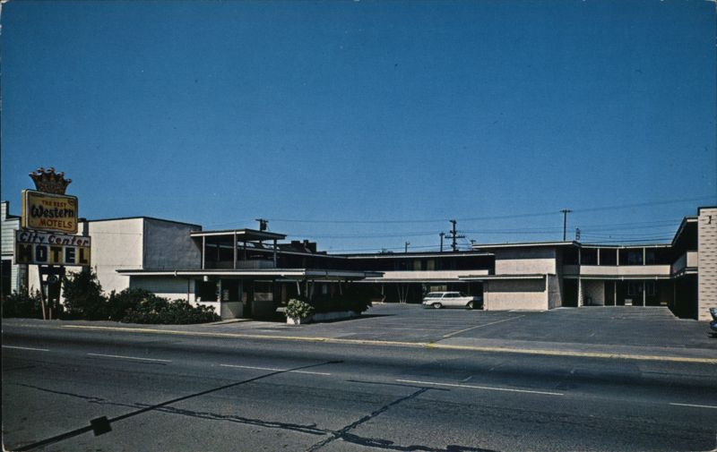 View of the Best Western City Center Motel located at 410 W. Wishkah on U.S. Highway 101. The motel features room phones, televisions, and individually controlled electric heat, with the motto 'Your Comfort Is Our Concern'.