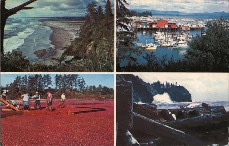| Four scenes from the Long Beach Peninsula: a panoramic view of the peninsula coastline, a fishing harbor in Ilwaco with numerous boats, a cranberry harvest with workers in a vibrant red field, and large waves crashing against a rugged shoreline during a storm. |