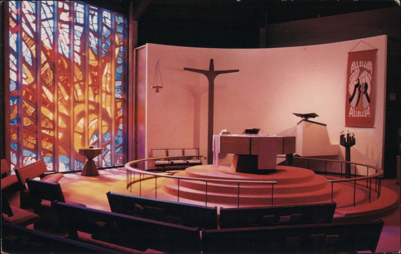 Interior view of the church sanctuary featuring a large stained glass window, altar, cross, pulpit, and pews. A banner with 'ALLELUIA' hangs on the right wall.