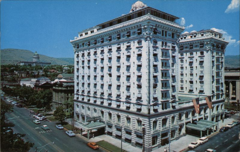 Located in the heart of historic Salt Lake City, the Hotel Utah is one of the west's outstanding hotels. It offers the visitor an unexcelled view of Temple Square and other points of interest. Utah State Capitol may be seen in the background.