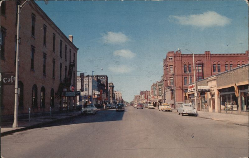 A bustling street scene in a city, with multiple commercial buildings, parked cars, and a bus depot visible on the right.