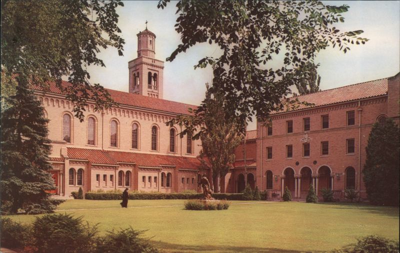 View of the Chapel of Saint Mary of the Angels from the north-west corner, showing Alverna Hall, the Sisters' residence, and the Campanile.