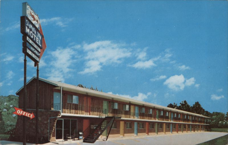 Two-story Slumber Inn Motel building with a prominent vertical sign and an 'OFFICE' arrow pointing to the entrance. The building features a multi-colored facade and a paved parking area in front.