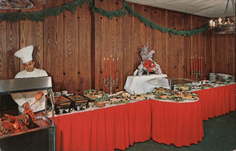 A chef carves meat at a bountiful buffet table in the Hotel Secor's Chestnut Room, adorned with festive garland and Christmas decorations. The buffet features prime ribs, fowl, seafood, salads, and desserts.