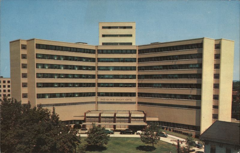 View of the multi-story Grace-New Haven Community Hospital, also known as the Memorial Unit of Yale-New Haven Community Hospital, with trees and cars in the foreground.