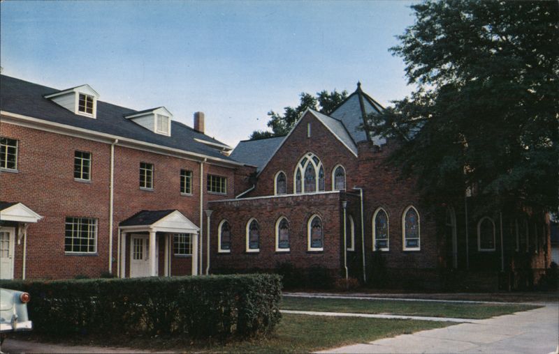 | A view of the First Baptist Church, a brick building with a large Gothic-style section featuring arched windows with stained glass, connected to a rectangular building with multiple windows. A well-maintained lawn and shrubbery are in the foreground. |