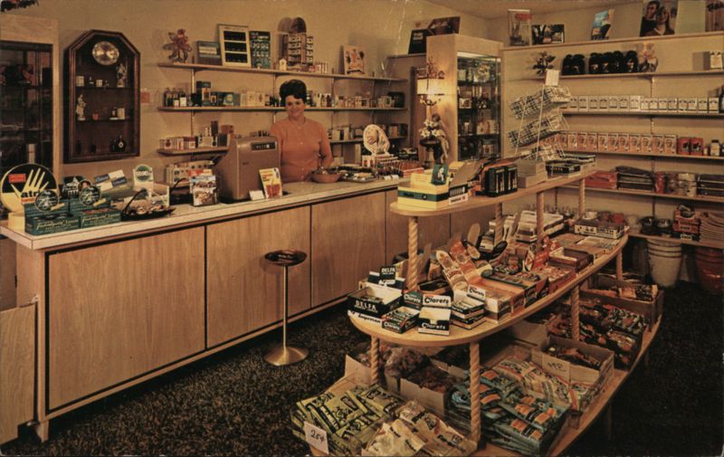 View of the interior of Alpine Perfumes, showing a woman standing behind a long wooden counter. Shelves are stocked with perfumes, colognes, beauty aids, and toiletries. Display racks in the foreground hold various products for sale.