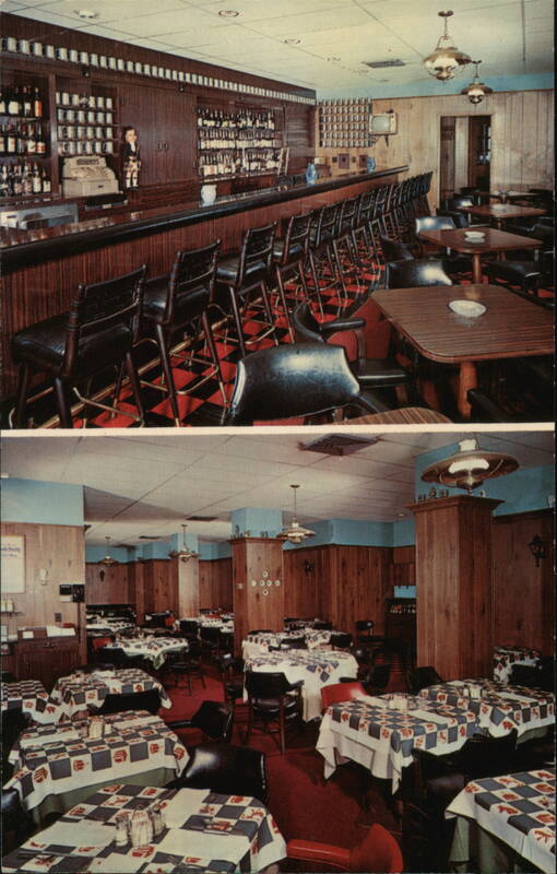 Cleveland's English Type Pub and Restaurant, featuring a long bar area with stools and dining rooms with checkered tablecloths. Known for its "Eye Of The Rib" and Hamburger.