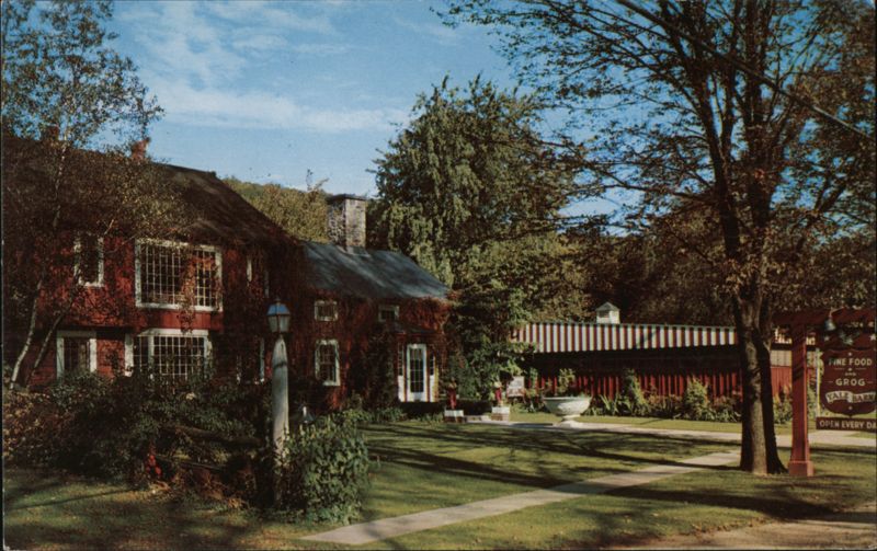 A view of the Yale Barn, a red-walled building known for fine food and grog, open from April to November, serving luncheon, tea, and dinner. It also features an Americana Grog Alley and Country Store. Located on Route 44, between Canaan and Norfolk, Connecticut. Kenneth E. Frazee was the host. |