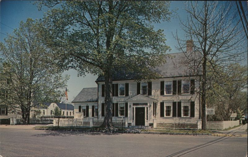 View of The Guilford Savings Bank, established 1875, housed in an 18th-century setting, with a white picket fence and large trees.