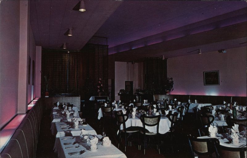 Spacious dining area of Tahiti Restaurant featuring multiple tables with white tablecloths, booths along the wall, ambient lighting, and a stage area. The restaurant served Chinese, Polynesian, and American foods.