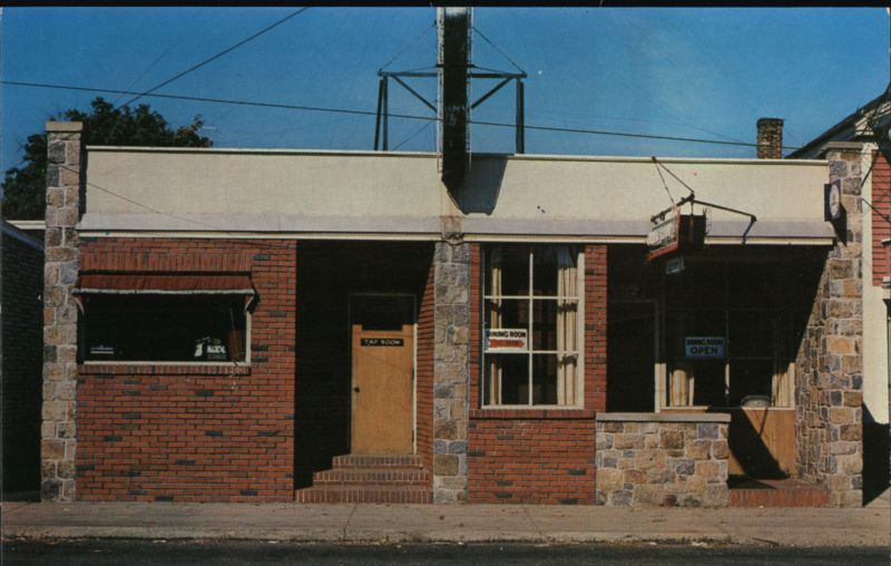 Exterior view of the Lincoln Inn, a building constructed with brick and stone, featuring a 'TAP ROOM' entrance and a 'DINING ROOM' section with an 'OPEN' sign.