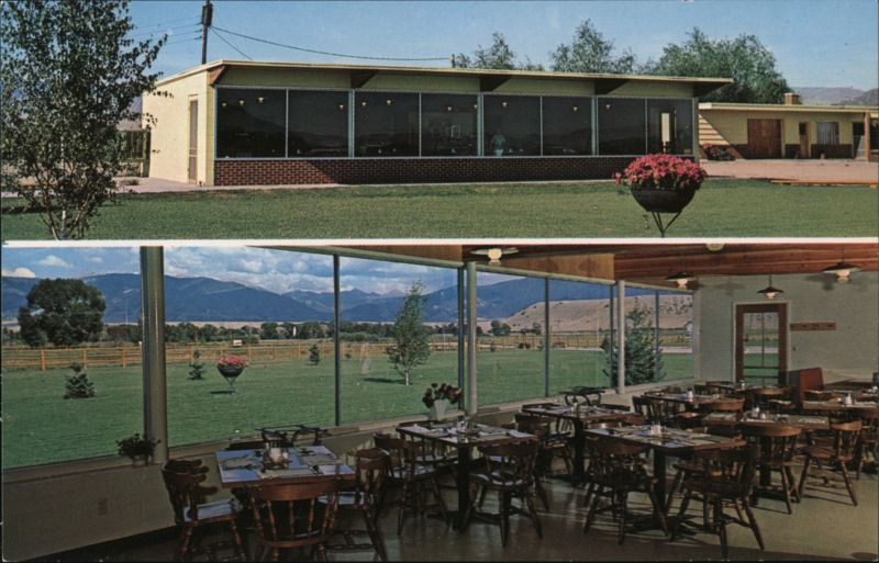 Exterior and interior views of Secora's Country Kitchen, a restaurant located on Highway 287, offering fine food and views of the Madison Range of Mountains.