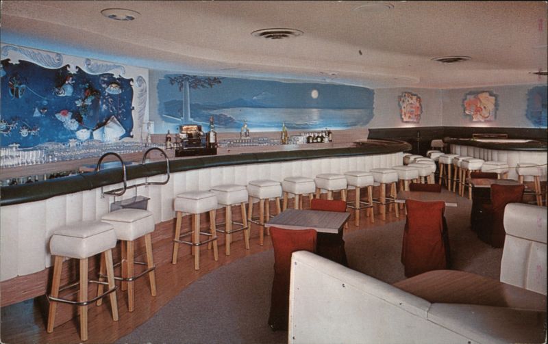 Interior view of the beautiful Vesuvian Lounge, part of Vaccaro's Italian Restaurant & Cocktail Lounge, featuring mural paintings of Italy and a piano-bar. This establishment also includes the Emperors Dining Room.
