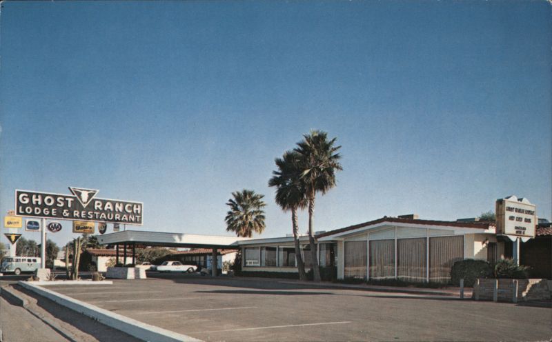 A view of the Ghost Ranch Lodge & Restaurant featuring a large triangular sign, a covered entrance, several palm trees, and a parking lot.