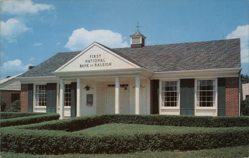 The First National Bank of Raleigh's drive-in branch located at Fairview and Oberlin Roads, described as Raleigh's most attractive branch bank with a drive-up teller's window.