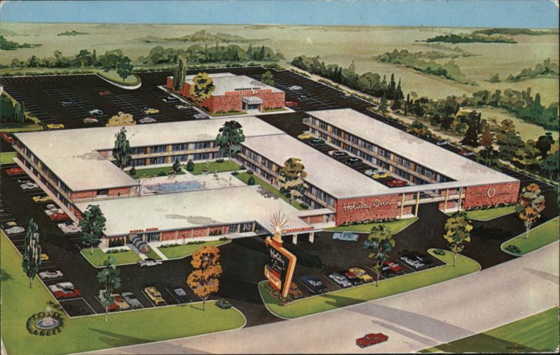 An aerial view of the Holiday Inn complex featuring the Meeting Hill Convention Center, a swimming pool, and extensive parking. Also includes a restaurant and bar.