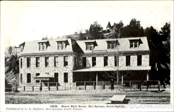 Front: TETEE 1099 12244. THE BRAUN BATH-HOUSE Braun Bath House, Hot Springs, South Dakota. Published by L. E. Highley, Hot Springs, South Dakota, Back: THIS SPACE CAN BE USED FOR A WRITTEN MESSAGE, USING ONE-CENT STAMP