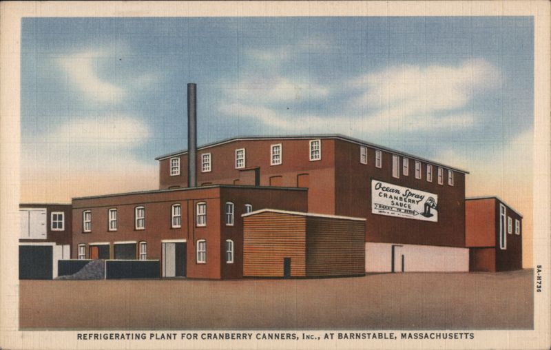 | Cranberry refrigerating plant at Barnstable (with a duplicate at Chatham) where vine-ripened cranberries are quickly frozen by a special process capturing their flavor and food value at the perfection point. These berries are then canned as needed, assuring consumers "fresh pack" Cranberry Sauce every day in the year. The capacity of the two plants is 4,000,000 lbs. Ocean Spray is the growers' own brand, packed and backed with New England conscience and tradition. |