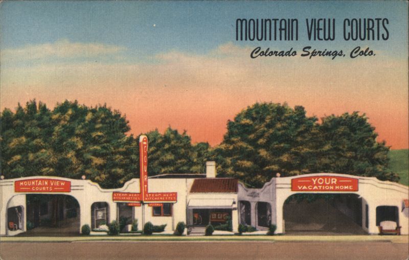| Front view of Mountain View Courts, offering 40 units of hotel rooms or housekeeping facilities, with combination tub and shower baths and steam heat. Located at the South End of Colorado Springs on U.S. Highway 85 & 87. Member of the American Motor Hotel Association and Colorado Springs Chamber of Commerce. |