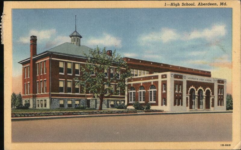 Two brick school buildings, one with a cupola on its roof, and an adjacent building with 'ABERDEEN HIGH SCHOOL' above its entrance.