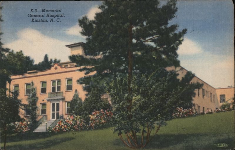 | The Memorial General Hospital in Kinston, North Carolina, a large multi-story building with a light-colored facade, is surrounded by numerous trees and well-maintained landscaping. A prominent, large tree stands in the foreground, with flowering shrubs and a grassy lawn leading up to the hospital's main entrance. |