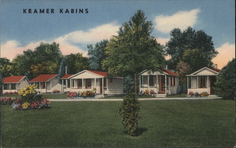 Kramer Kabins, noted for 'Cleanliness Our Specialty' in a New England setting on Route U. S. 1. The image shows several small, white cabins with red roofs, set on a green lawn with trees in the background.