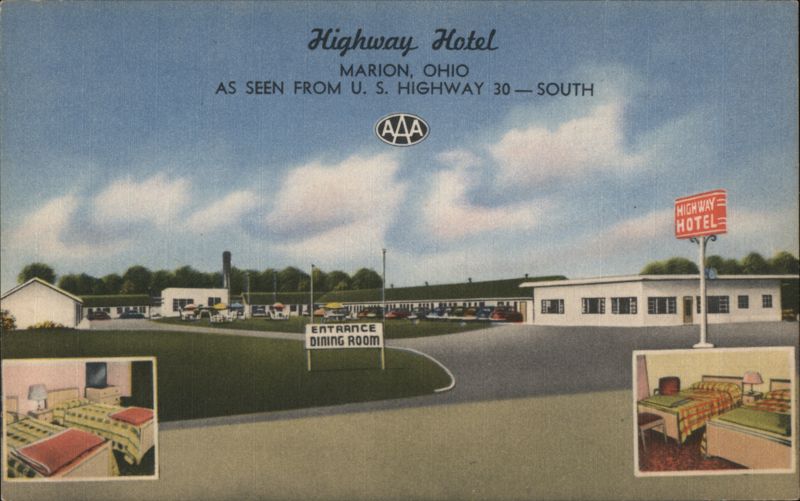 View of the Highway Hotel, Ohio's largest and finest motor hotel, featuring 54 rooms accommodating 125 guests. Amenities include a dining room, room service, reading lounge, television, metal furnishings, telephone, tile bath, shower, and hot water heat. Located on U. S. Route 30 S, east edge of Marion. |