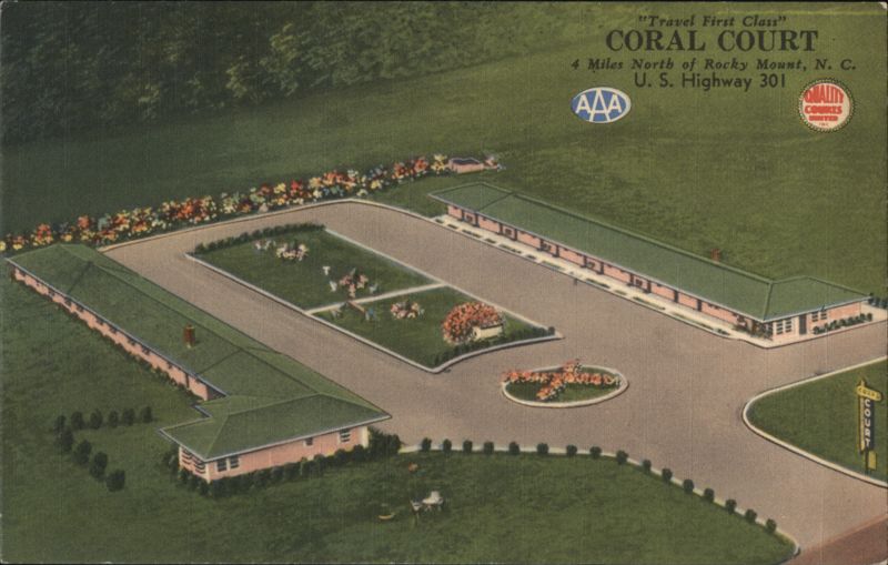 | Aerial view of Coral Court, a AAA and Quality Courts United approved motel featuring 20 air-conditioned guest rooms, private tile baths, radiant heat, radios, and an adjoining restaurant. Located 4 miles north of Rocky Mount on U.S. Highway 301, owned by Nelle E. Orr and Leon Wright. |