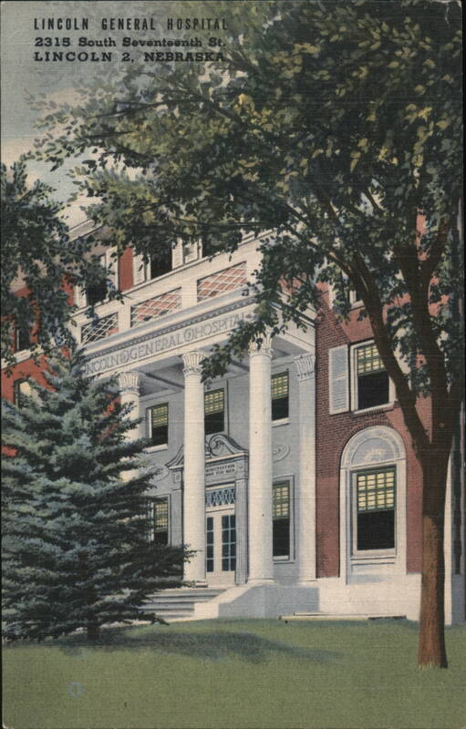 Front exterior view of Lincoln General Hospital, a non-profit, general, non-sectarian hospital with 200 beds and 40 bassinets capacity. It also housed an accredited school of nursing, approved by the American Medical Association, American College of Surgeons, and American Hospital Association. |