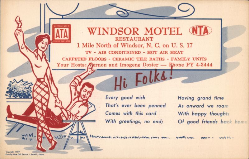| An illustrated advertisement for the Windsor Motel and Restaurant, featuring a woman and a man in a leisure setting. The card highlights motel amenities such as TV, air conditioning, hot air heat, carpeted floors, ceramic tile baths, and family units. It also mentions the hosts, Vernon and Imogene Dozier, and includes a short poem. |