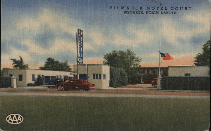 View of the Bismarck Motel Court featuring multiple single-story units, a tall neon sign displaying 'Motel Court', a red car parked in the driveway, and an American flag flying. A green lawn is in the foreground.