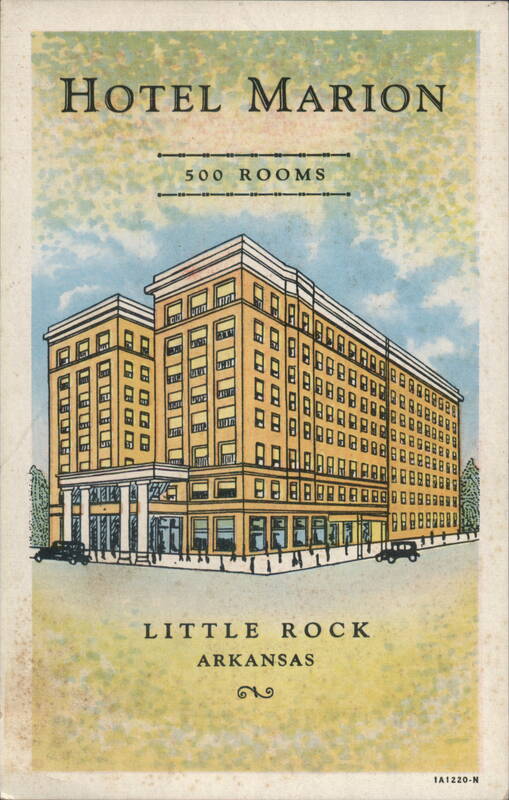 Illustration of the Hotel Marion in Little Rock, Arkansas, a large hotel building with 500 rooms. The hotel is known as 'The Meeting Place of Arkansas'.