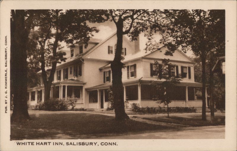 A multi-story inn with large wrap-around porches, situated on a lawn with numerous large trees.