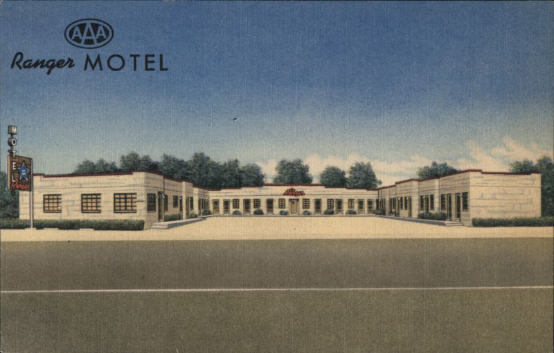 View of the Ranger Motel, featuring 32 modern units with telephone, free radios, and all tile bath rooms. Located 4 blocks north of the Post Office on Highways #287 and #30.